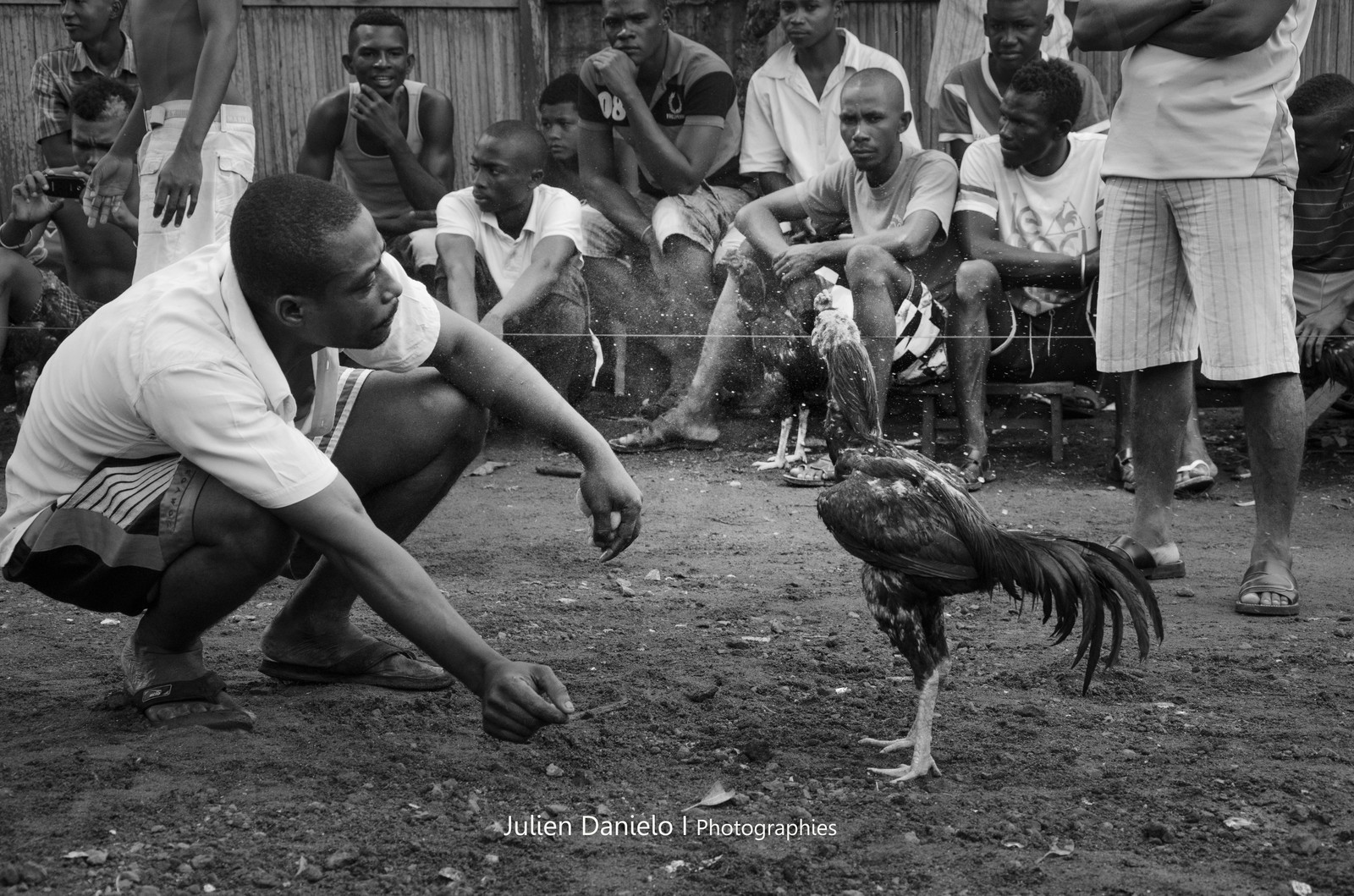 | Description | Combat de coqs à Djamandjary - Madagascar. Un dimanche matin, les hommes de Djamandjary se réunissent sur une placette au couvert d'un grand arbre, peut-être un manguier, autour d'un carré où vont s'affronter les meilleurs coqs. Avant chaque combat, les billets fusent, volent au-dessus de nos têtes, on ne comprend pas grand chose. . Chaque partie se joue en trois manches, la première est la plus longue, aucun accessoire n'est rajouté au coq, pas de griffes en métal ou autre objet de ce type. Le but est d'éjecter l'adversaire en dehors du carré, qu'il prenne la fuite. C'est pourquoi les manches 2 et 3 sont aussi courtes, le coq est épuisé. Il n'y a donc jamais de mise à mort. Le coq est ici chouchouté même s'il ne ressort pas indemne. |